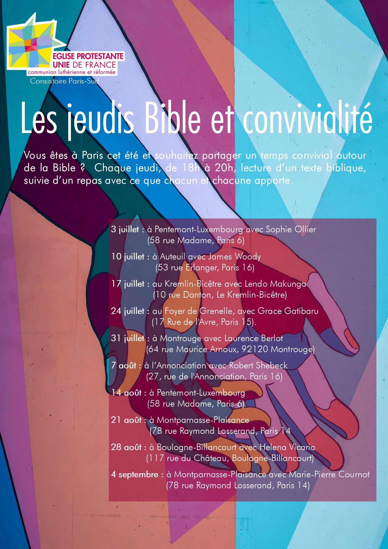 Vous êtes à Paris cet été et souhaitez partager un temps convivial autour de la Bible ? Chaque jeudi, de 18h à 20h, lecture d’un texte biblique, suivie d’un repas avec ce que chacun et chacune apporte.